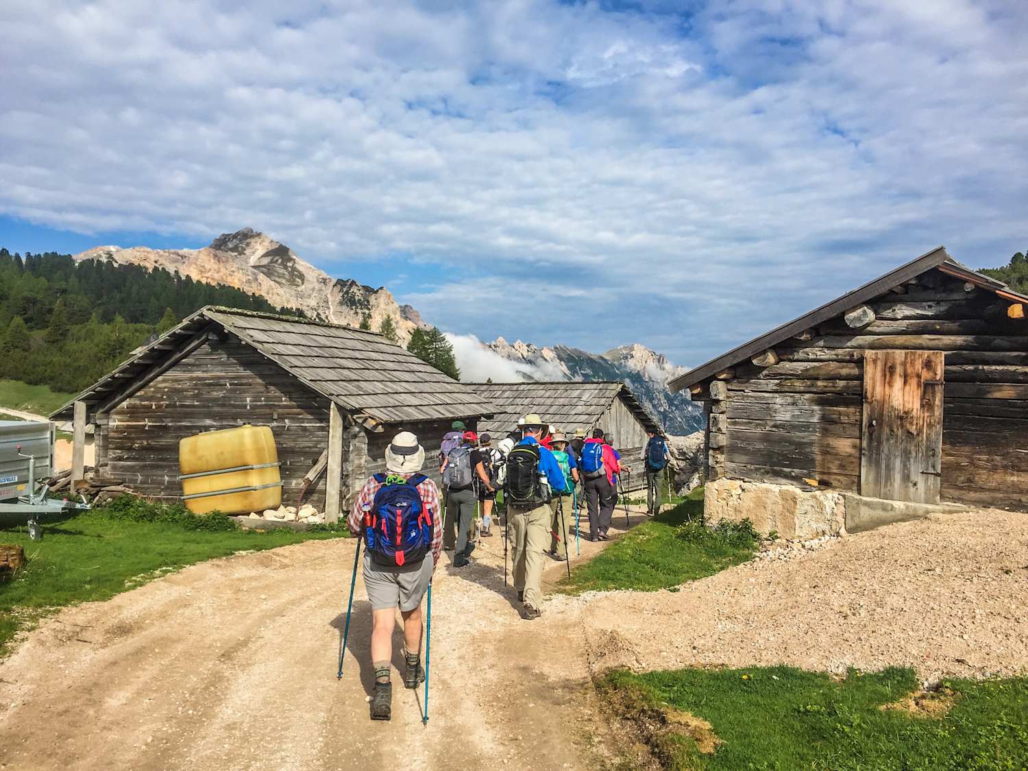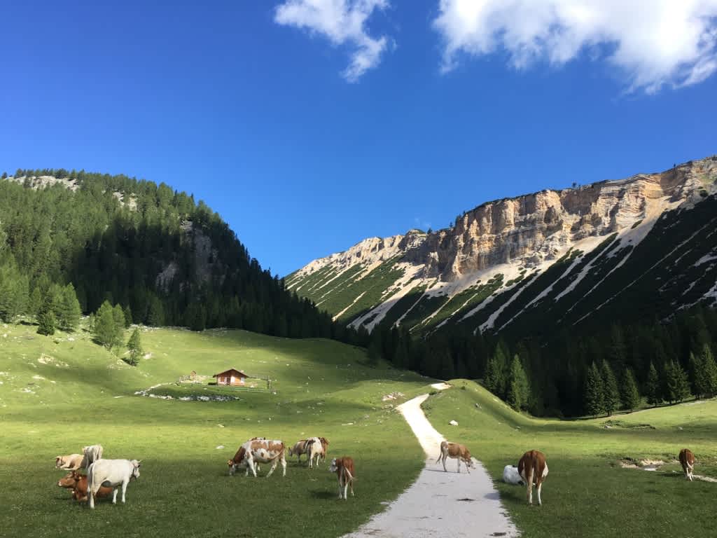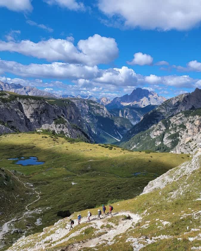 For others who chose not to do the Via Ferrata, we’ll drive to Il Forte at Passo Valparola where we’ll begin hiking to Passo Falzarego (2,105 m / 6,906'). The hike starts with a gentle ascent across grassy hillsides, and as we gain elevation the terrain becomes rockier, interspersed with wildflowers such as gentians and pink thrift. We’ll take a short break at Lago di Limedes, then return along the same route to Passo Falzarego and take a cable-car up to Mount Lagazuoi, where you'll meet up with the rest of the group.